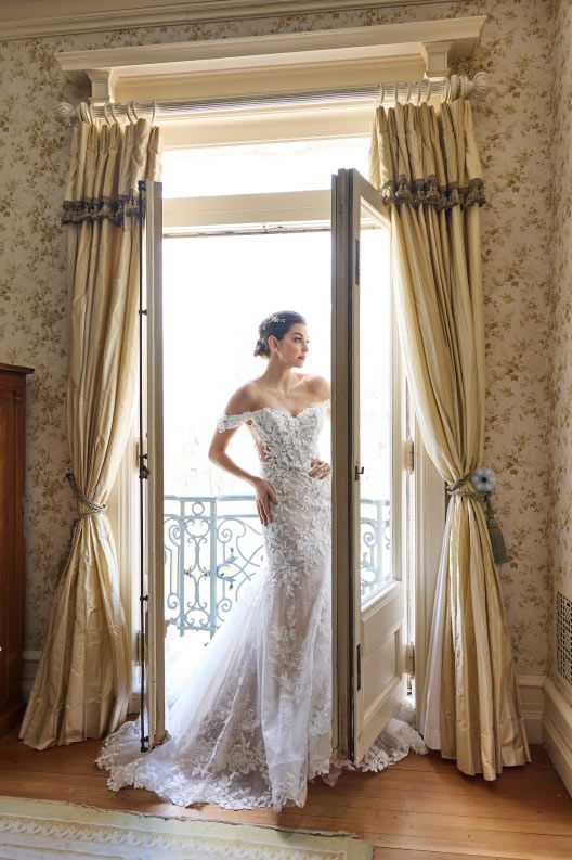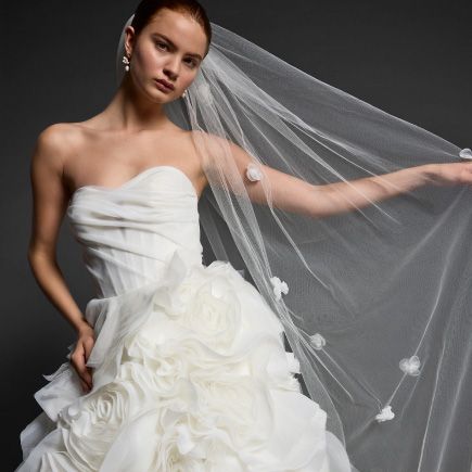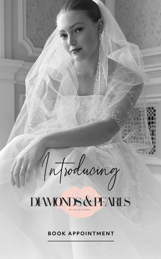 woman in a wedding dress and veil sitting promoting introducing diamonds & pearls by david's bridal book appointment