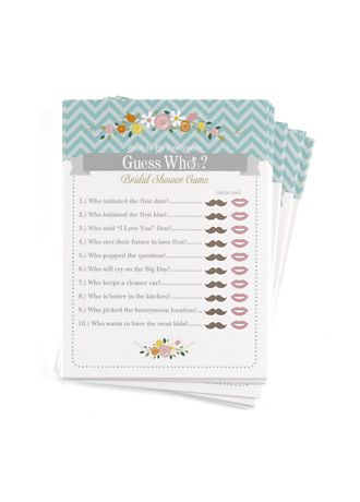 How well do guests know the Bride and Groom? Find out with a fun game that can be played at a bridal shower, engagement party, or rehearsal dinner! The Guess Who game cards feature questions about the couple. Guests circle a mustache for the Groom or lips for the Bride, for each question. Whoever gets the most correct wins!