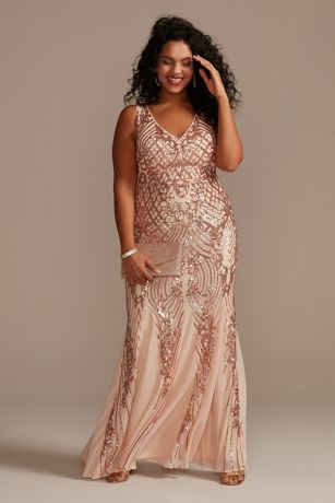Sequins cover the tank straps and bodice of this exquisite sheath dress, trailing all the way down to the flowy mesh godet hem. Wear it for prom or any spring formal.